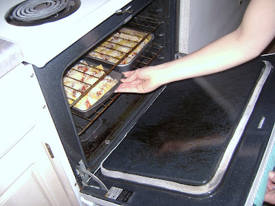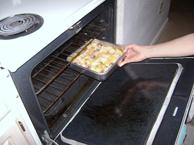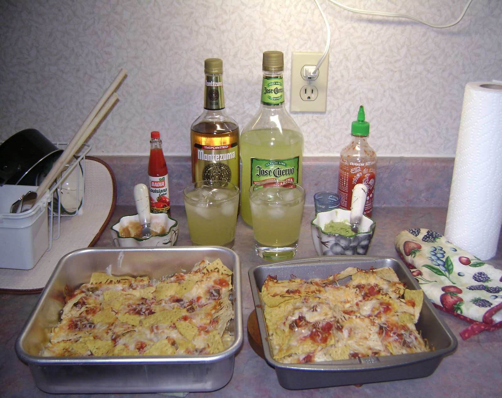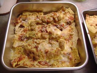 I had the smaller pan (left), the Mr. had the larger pan (right). We basically just piled lots of chips, salsa, beans, and cheese together and stuck it in the oven. |