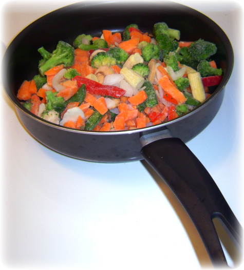 - Put bag of frozen, mixed stir-fry veggies in. Mix together.