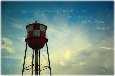 This photograph seemed like a blank canvas that I could do almost anything with, from the beginning. I straightened, sharpened, and brightened it a bit. I really wanted to do something with the space on the right, so I found a quotation that would look nice in the upper right corner. I didn't want to disturb the clarity of the clouds or the water tower, so I mostly left those alone. The overlayed stamps were put in each of the corners, and then blurred the edges.